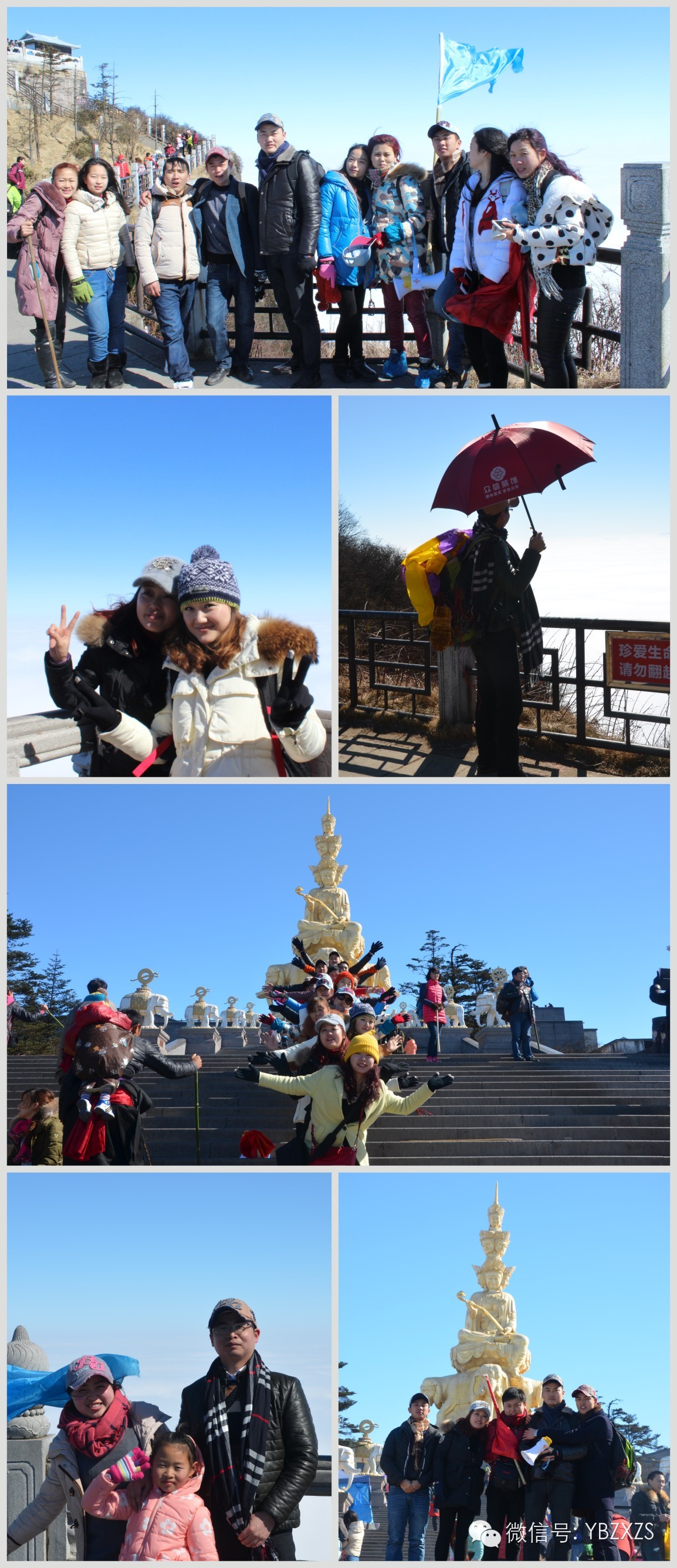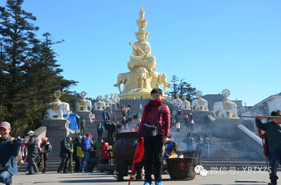 终于我们来到了金顶,阳光很大,很暖和,照着金佛,佛光普照,崇敬之心油然而生,大家都虔诚的膜拜祈求平安。冬季来峨眉,奔的就是雪中的金顶来的,雪中阳光下的金顶更是一种奇观,山顶上时而艳阳高照,时而白雾茫茫,迷雾里远望万佛飘渺,时见佛光飘浮,好一个如意的暖冬。