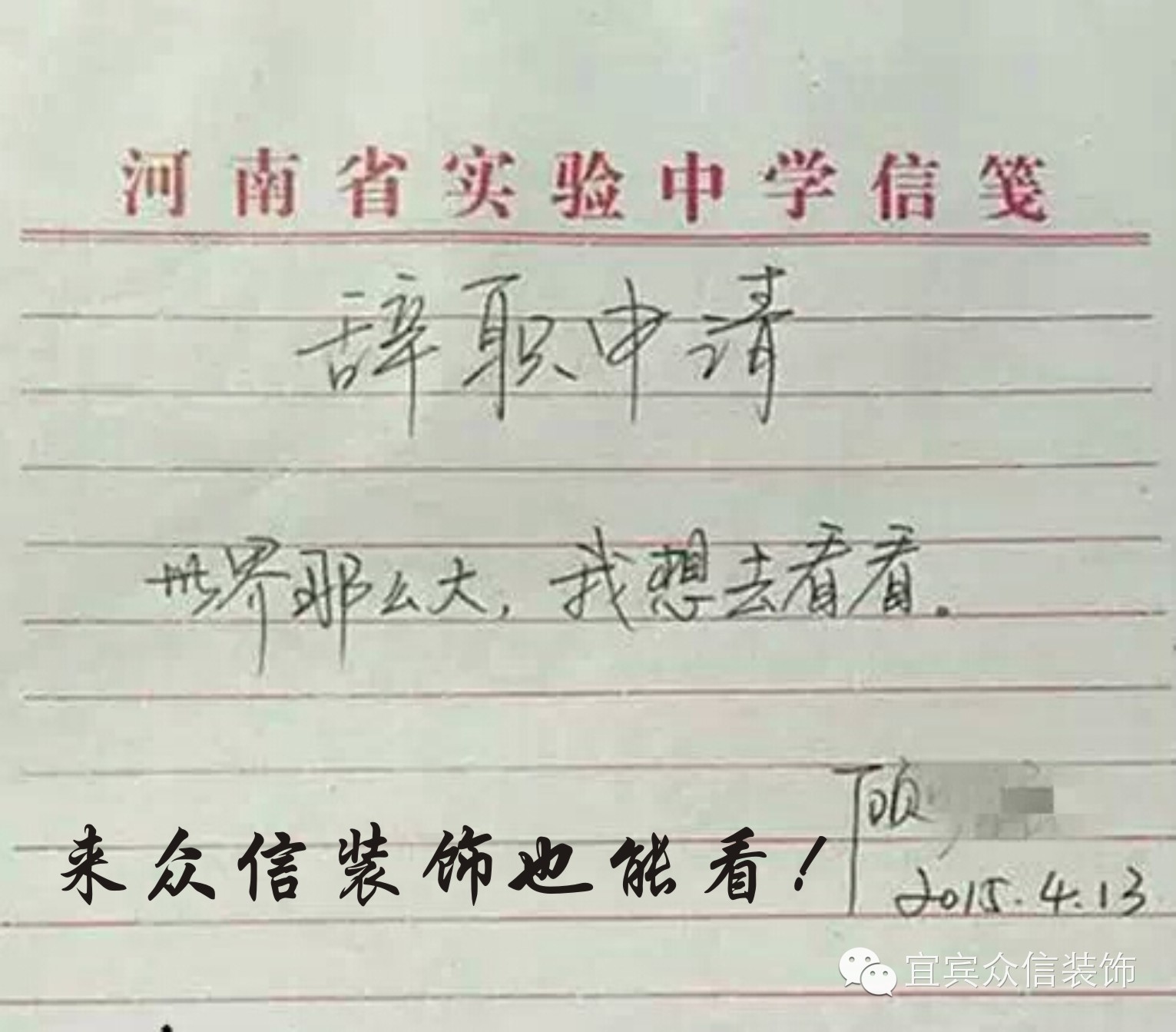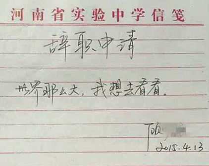 昨日一到公司,就看到手机QQ上腾讯推送的新闻:《女教师10字辞职信走红:世界那么大,我想去看看》。