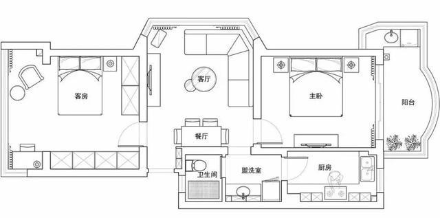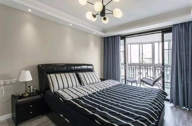 黑色真皮的床,搭配蓝白条纹的被子,色调上就呈现出业主是理智又成熟型的人;