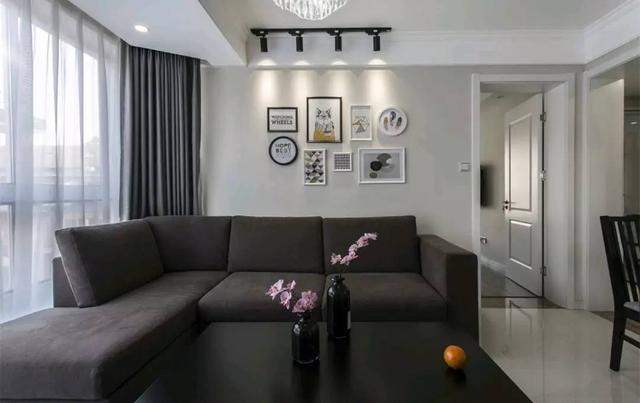 沙发背景墙则采用一组挂画装饰,顶上安装了导轨射灯,在灯光的照射下明暗对比,呈现一个简约时尚的居家环境;