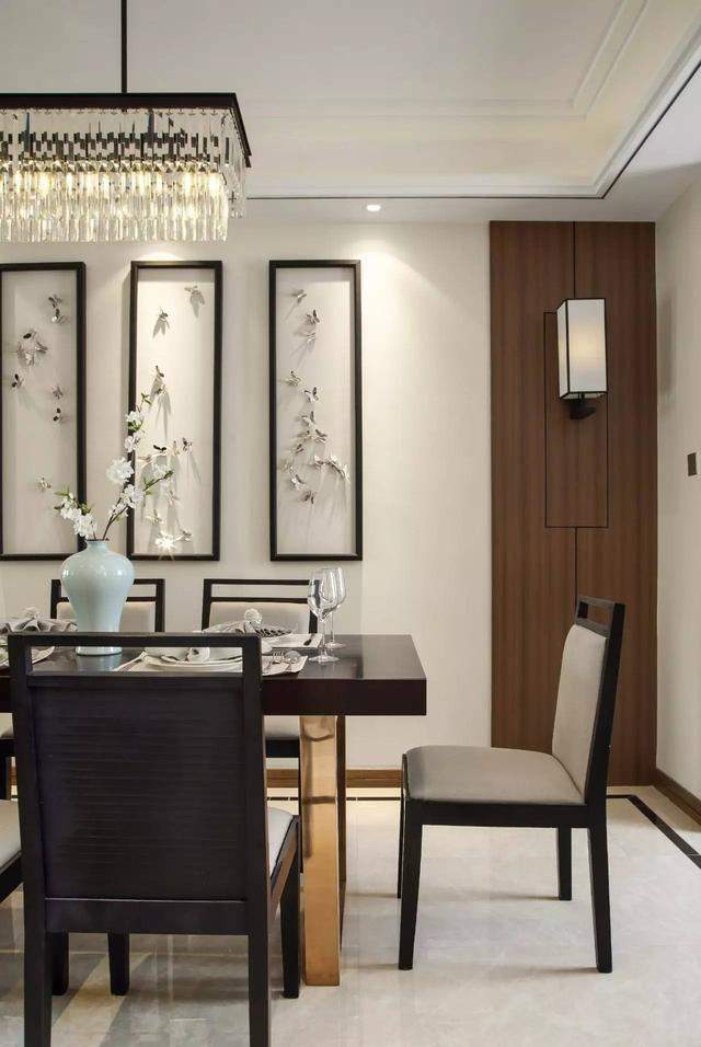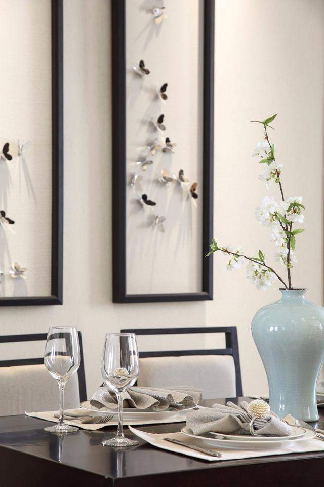 餐厅延续了客厅的设计,背景墙两边采用木饰板+壁灯的形式,中间则是深色边框把蝴蝶饰品框起组成与众不同的装饰画;