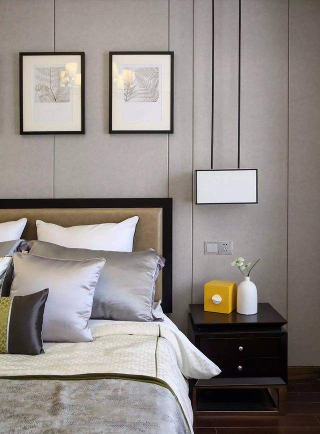 次卧背景墙做成硬包,再用一组装饰画装饰,呈现出很有品质的生活;