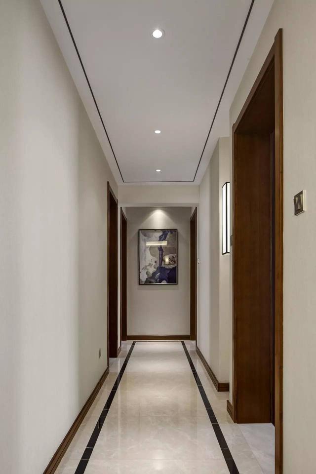 浅色的墙面与木色的门框相撞,同时踢脚线采用与门框相同的颜色,然后顶面及地面分别用了黑色线条点缀,让原本看起来单调又狭长的过道变得很有设计感,很耐看;