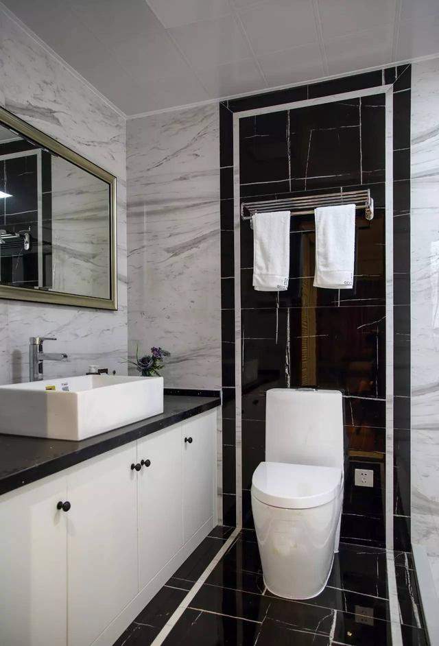 黑白灰经典色搭配的卫生间,现代感十足,去掉纯中式的复杂,用现代的手法设计出更符合现代人的审美观;