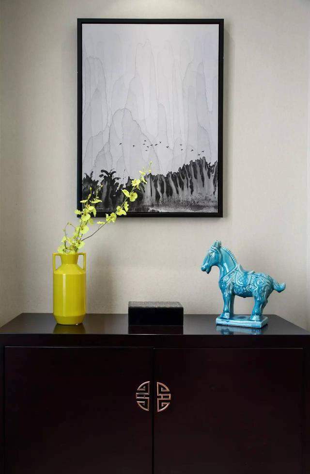 玄关,搭配一款深色鞋柜兼端景台,台面摆放一个嫩黄色的花瓶和天蓝色的马,墙面再用一副抽象派山水画装饰,如此简单,但呈现出来的却是一个具有中式韵味的玄关,吸引眼球;