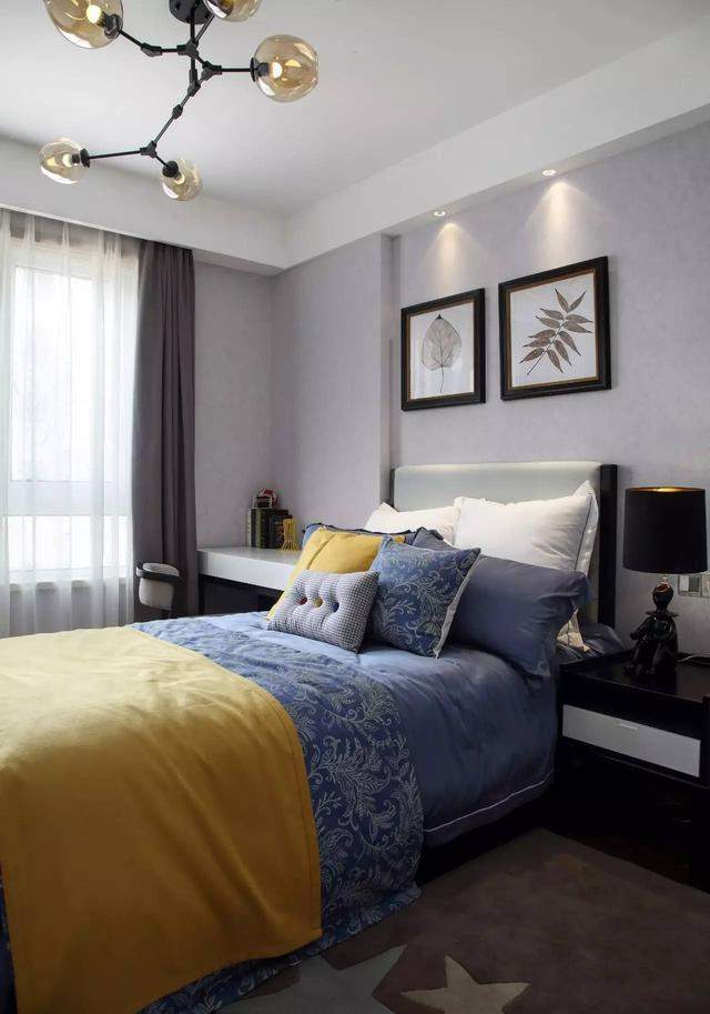 儿童房的设计则偏向实用性,没有太复杂的硬装造型,更多的是在软装上下功夫,蓝色系列的床品,一边摆放书桌,另一边摆放床头柜,让整个卧室的实用性做到最佳;