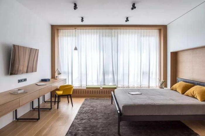 ▲床尾长排的书桌为提供了充足的共同在家办公空间,窗户的飘窗则是一个非常情趣的休闲看书、晒太阳的角落。