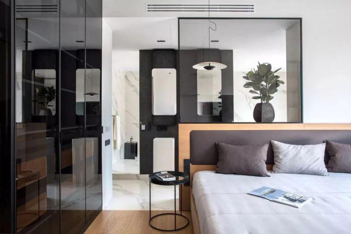 ▲主卧大胆的布局在床头背景墙加了一块玻璃隔断,而衣柜也是以玻璃门为主,整体时尚大方,找衣服的时候也非常方便。