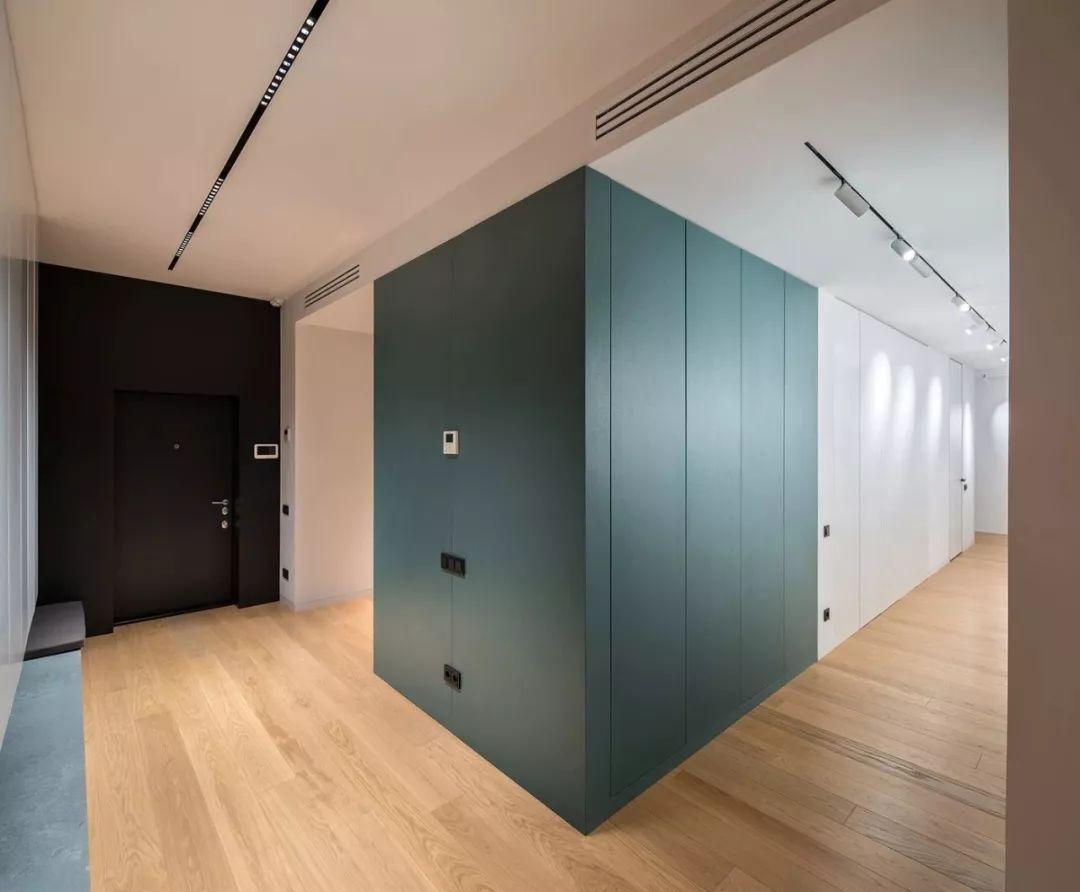 ▲从大门进来后,从黑色到青色再到白色的视觉,整个空间由深至浅的过渡,回家后的心情也慢慢地得以放松。而大面积的定制收纳柜,也为主人提供了丰富实用的储物功能。