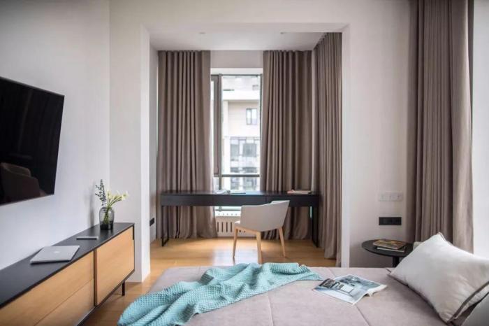 ▲次卧的窗户摆着一张悬空书桌,整体空间也是比较宽敞舒适,提供了一个休息与办公结合的空间。