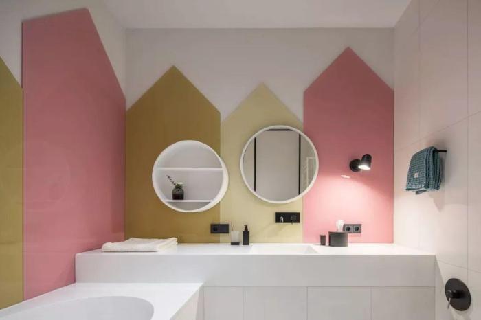 ▲儿童房的卫生间以粉色、棕色、米白色组合的屋形造型,结合圆镜与搁架,显得童趣而又温馨。