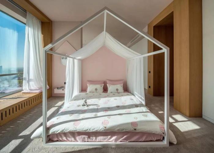 ▲儿童房的床头与床单都以粉色调为主,结合一个屋形的床架,带来了浪漫梦幻的空间感。