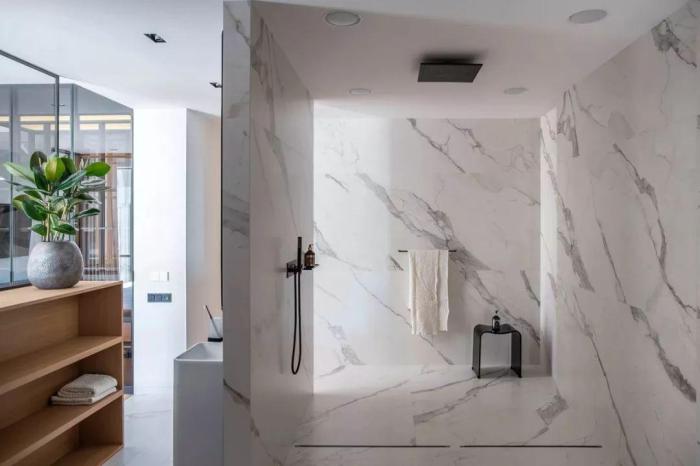 ▲床头后方隔着一个过道就是主卫区域,整个白色大理石质感的空间,显得优雅高档好自然。