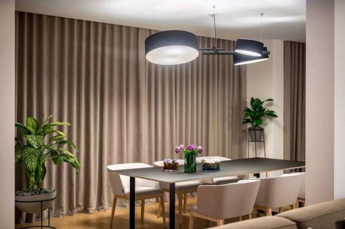 ▲餐厅有着大面积的落地窗,拉上窗帘后,开启黑色的盘形吊灯,黑色的餐桌台面上摆上精致的花饰,结合角落的绿植,带来了一个清新舒适的用餐气息。