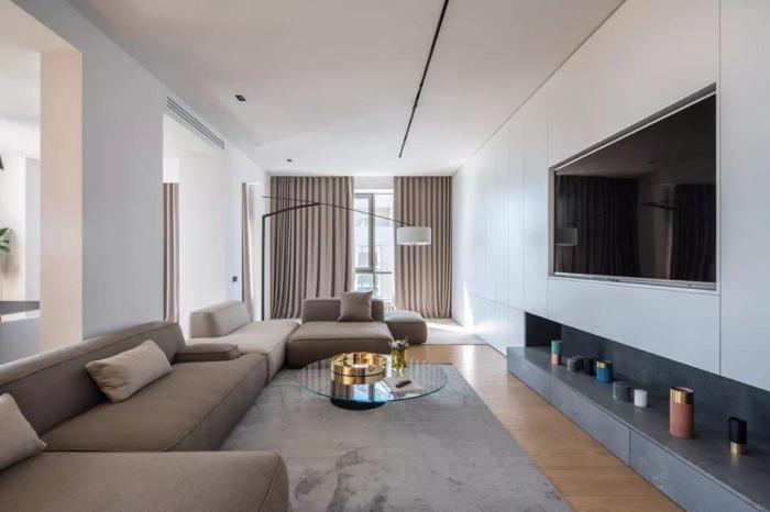 ▲客厅整体简洁大方的空间,电视墙是一体式的收纳柜,结合壁挂电视机与嵌入式的灰色电视柜,摆上素雅的各色摆饰,显得充满了雅致端庄的气息。