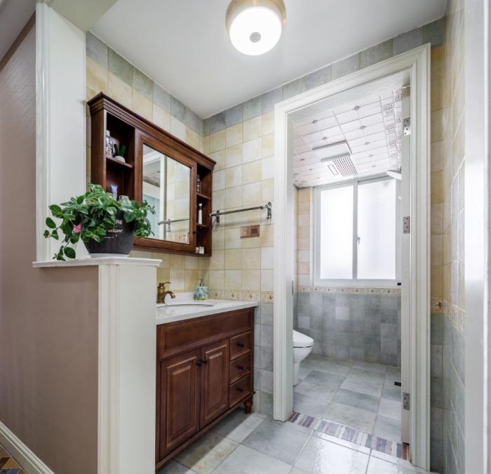 ▲卫生间洗手盆与走廊之间隔了一个小矮墙,矮墙台面装了大理石并摆了一盆绿植,过卫生间与走廊都浪漫了清新的气息。灰紫色的地砖墙脚+浅黄色墙面砖,让卫生间显得冷静而又温馨。