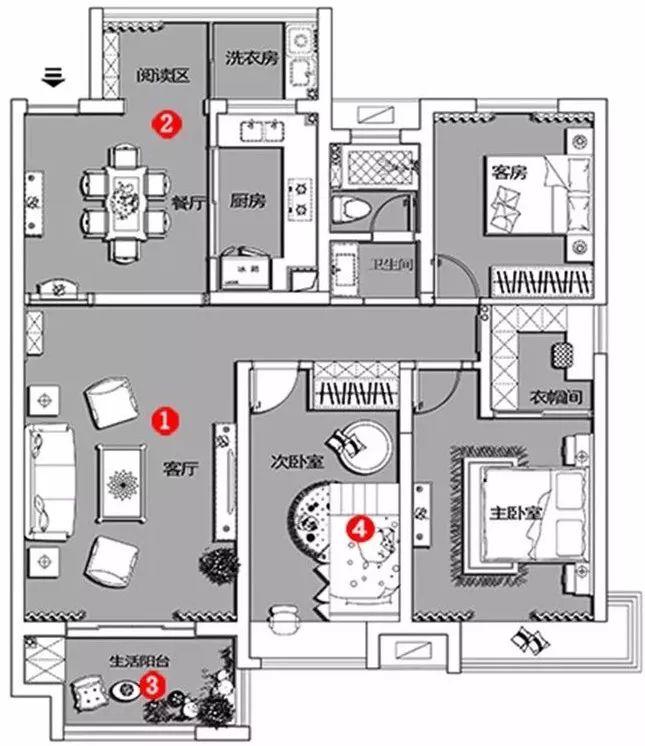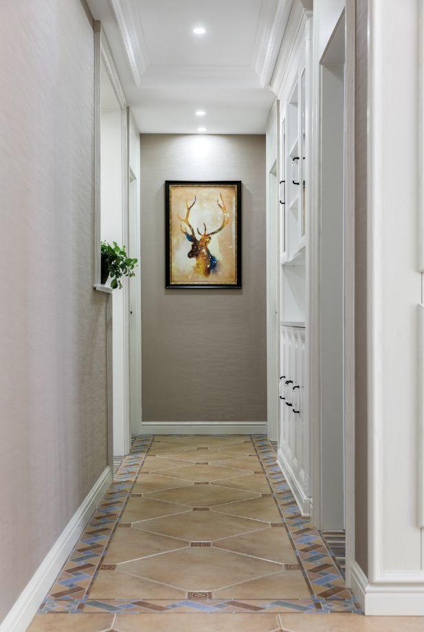 ▲走廊地面四周做了彩色边线,整体暖灰色的墙面,在走廊尽头挂上一幅鹿头装饰画,右侧墙面还与次卧共享墙面做了收纳柜,为房子保持优雅整洁的摆饰提供了储物保障。