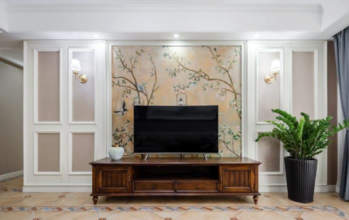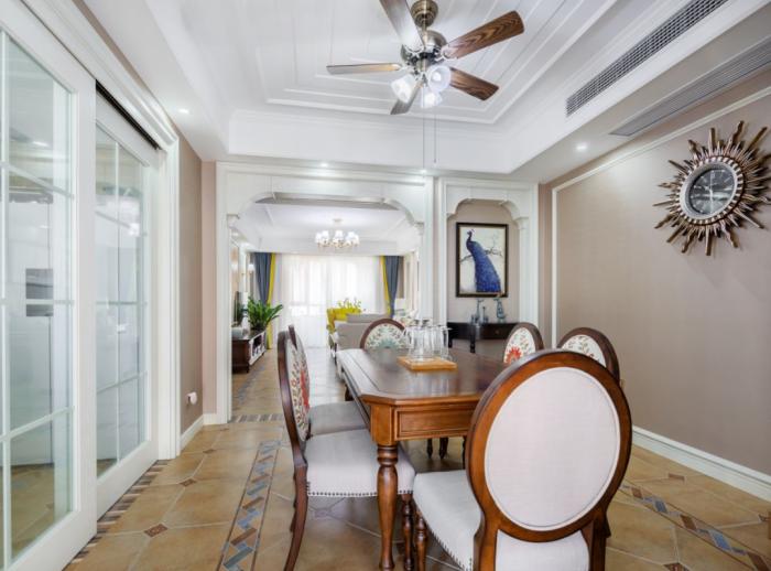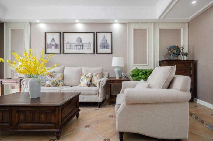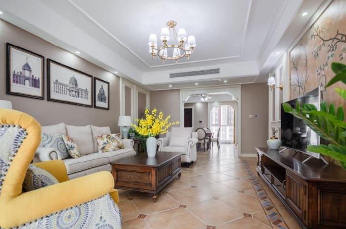这套130平米的现代美式风格装修中,整体以浅咖色的空间基调,搭配棕色仿古砖地面,还有现代美式的家具与跳跃的软装点缀,营造出一个华丽优雅的空间感,显得浪漫而又精致档次。