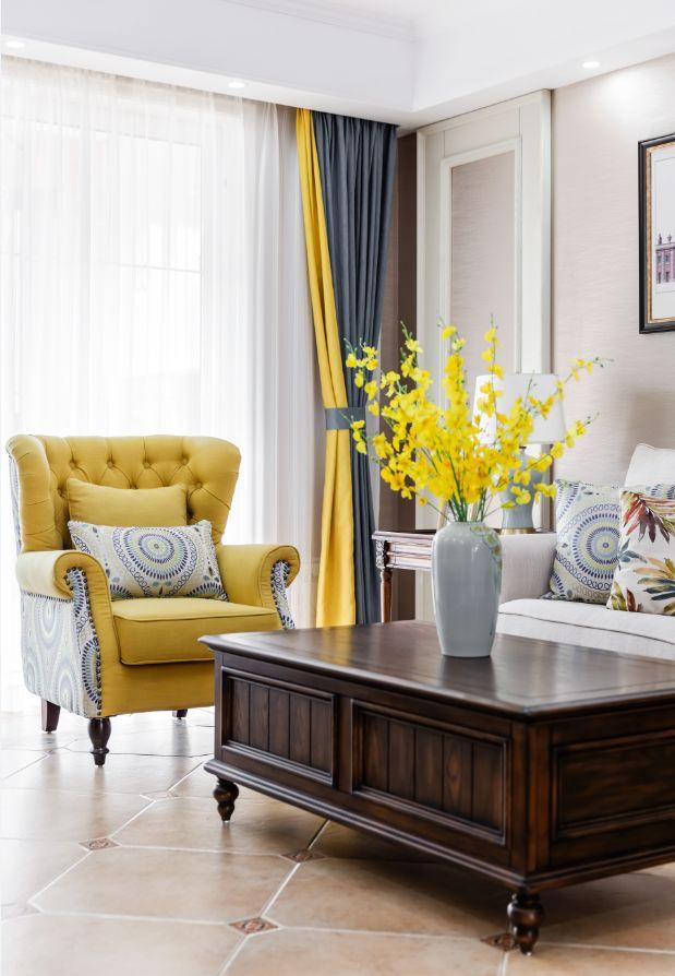 ▲灰黄配的窗帘,结合黄色的单人沙发椅,还有茶几上的黄色跳舞兰,为空间带来了几分跳跃活力的雅致感。