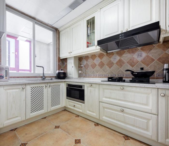 ▲仿古砖墙面地面几乎从,搭配白色橱柜,提供了个闲适的烹饪氛围,使得柴米油盐的生活也更加优雅。