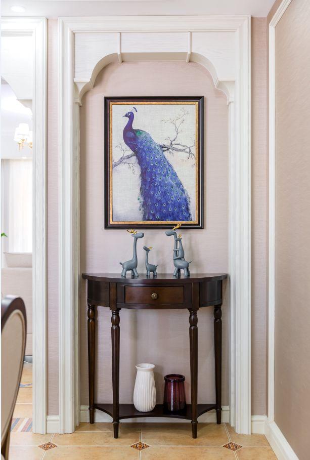 ▲进入玄关,棕色仿古砖地面与深木色的端景台、孔雀挂画让空间显得端庄气质,而奶咖色的墙面与白色踢脚线、框线装饰,则为空间带入了几分浪漫优雅的气质。