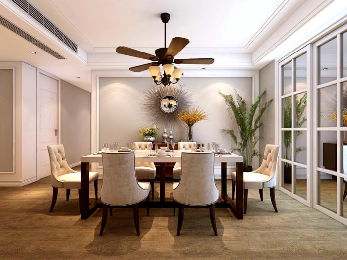餐厅的装修也非常有质感,典型的美式餐桌椅,精致的墙面装饰和充满自然气息的绿植,让餐厅每一处角落都十分精彩。尤其,顶部满是美式风情的风扇灯,是业主特别喜欢的装饰,也非常实用。