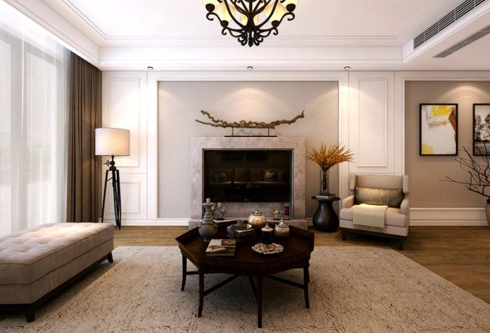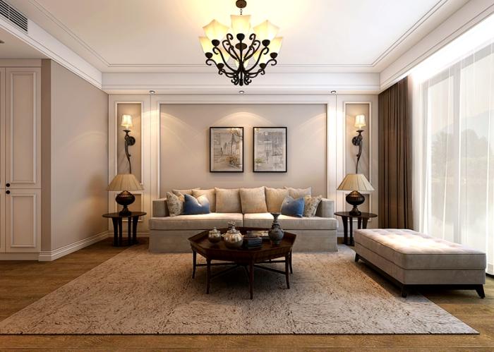 客厅在优雅的米色和白色调中展开,沙发、地毯也是同色系,和谐美观。
