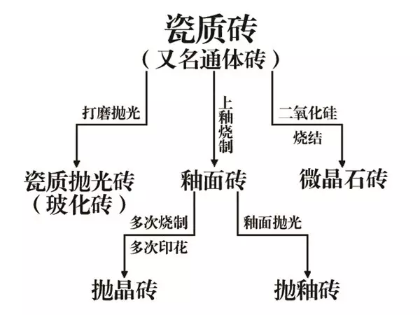 这张图比较全面的总结了目前市场上常见的家用地砖种类及其之间的关系。在购买地砖的时候我们可以根据这张图来判断该产品的基本属性。下面就来一一介绍一下。