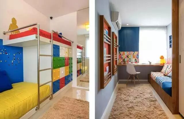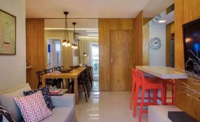 每个家长都希望把家打造成最能让孩子们开心玩耍、成长的样子吧!巴西室内设计Gisele Tarando设计的这座公寓,实现了家长们想要把家打造成孩子们的王国的愿望。在客厅,利用家具和色彩区隔处不同机能的空间,沙发上的靠垫装饰、墙上的壁画、各种不同颜色的椅子和大量的原木家具成了鲜明的对比。开放式厨房和装置的许多镜面,仿佛让空间变大两倍。