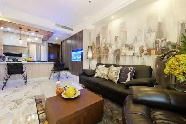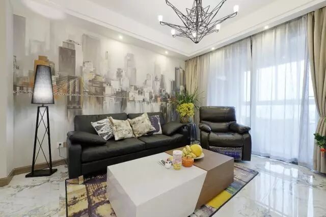 客厅的最大亮点在于沙发背景,这个独特风格的墙纸,给人一种都市水乡相结合的味道,既有工业大都市的繁华,又有宁静水乡的江南古韵。