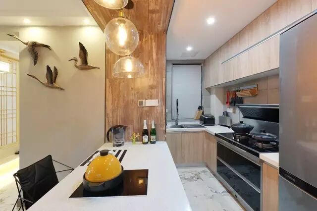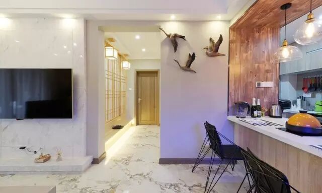 茶室出来到餐厅,墙面太单调总感觉少了点什么。大雁的点缀让空间更加丰满有层次感,配合原木调的温馨质感,一种高远、向往自然的意境呼之欲出。