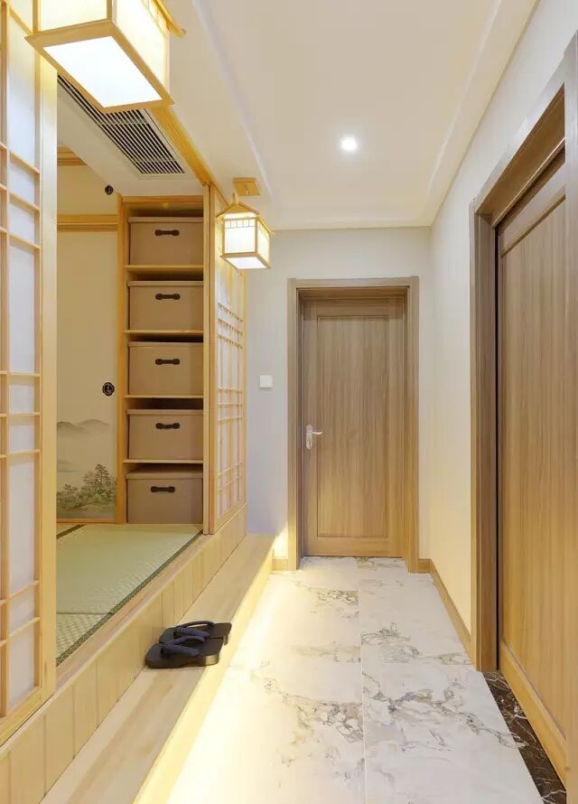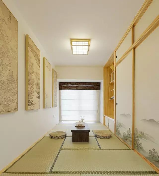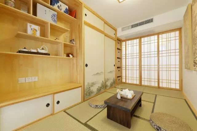 这间茶室最大的日式特点是横拉门,比用普通的推门大大地节省了空间。榻榻米茶室也是最近流行的设计,中间的桌子可以升降,可作为小会客室在里面和友人喝喝茶聊聊天,也可以作为书房。