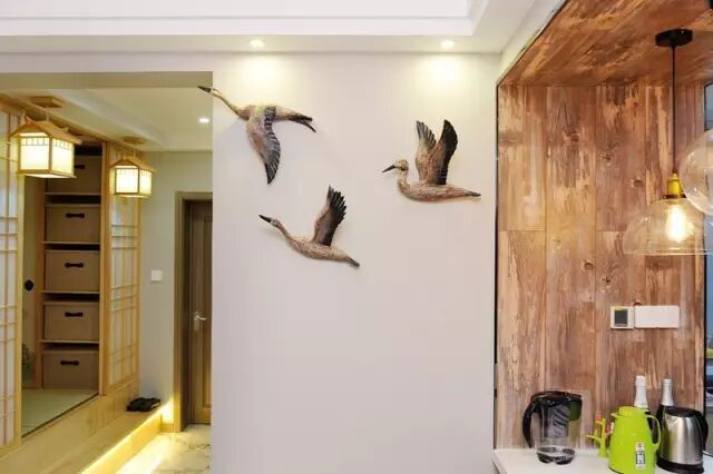 这几只大雁是设计师特意设计的,配合原木的格调,显得空灵唯美。从质朴的空灵里,我们看出了一个都市白领向往自然的心境。居室空间的打造,能够给人一种轻松、开阔、高远的心境,也算一包枯燥生活的调味剂。