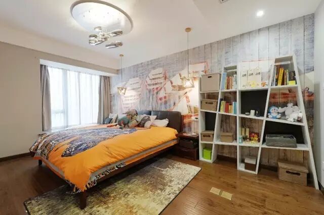 卧室的设计显得具有现代艺术气息,尤其是床背景的设计,非常艺术文艺。后面原先是木板,设计师亲手在木板上面作画,手绘出与整体格调一致的图案。几何形的书架收纳强大,非常实用。