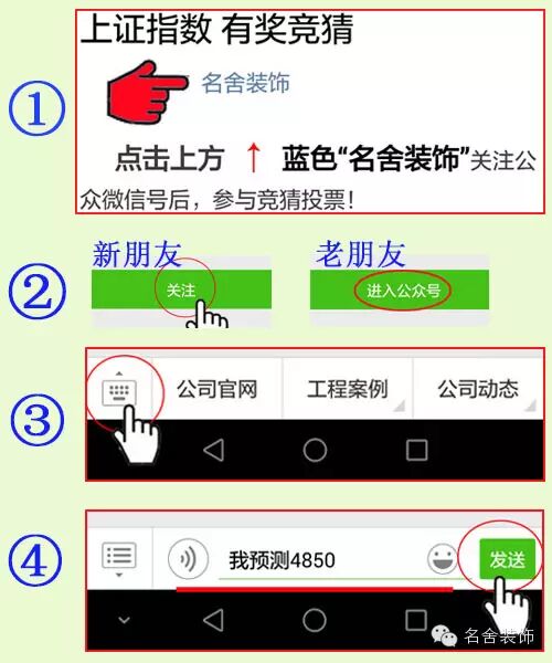 关注名舍装饰公众微信号后回复你所竞猜数据到微信后台(如下图)!