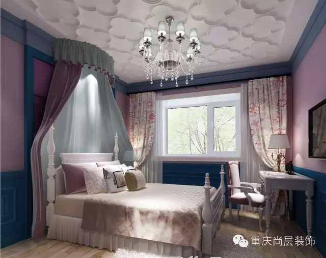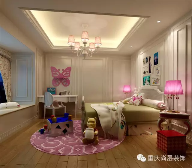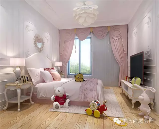 女儿房为了符合其年龄阶段的使用,颜色色调偏向于粉红色。整个空间搭配烘托出其活泼、可爱不失温馨。