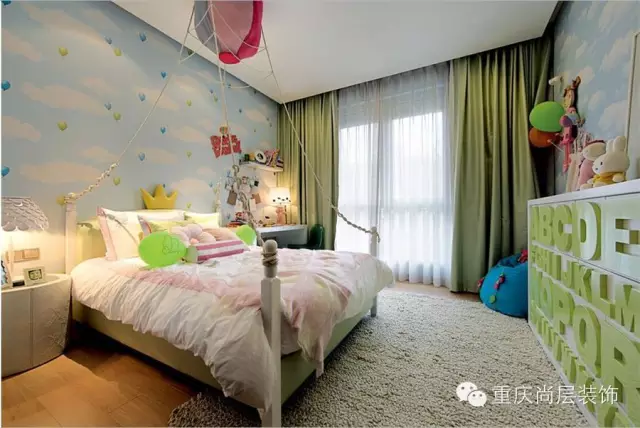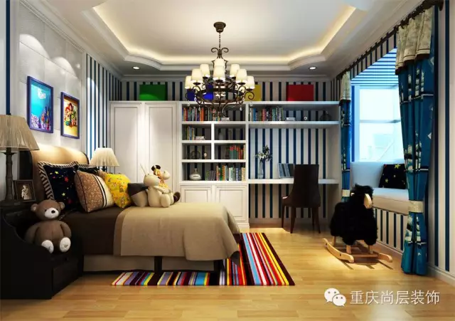 玩耍是孩子的天性,白色与多层次的蓝色作为主色调,将蓝天白云的自然气息引入室内,自由玩耍的天地。在设计中,以体现对孩子人性化的关怀为重中之中。简单大方的装修风格,减少室内污染给孩子带来的终身遗憾。孩子的想象是非常丰富的,多一些丰富的图案有利于孩子的智力开发。合适且充足的照明,能让房间温暖,有安全感,有助于消除孩子独处时的恐惧感。