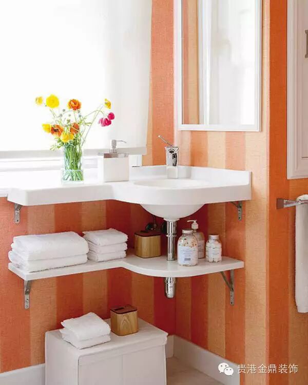 台盆下的转角收纳搁架,虽然不大,但是设计很巧妙,也可以放上不少物品呢。