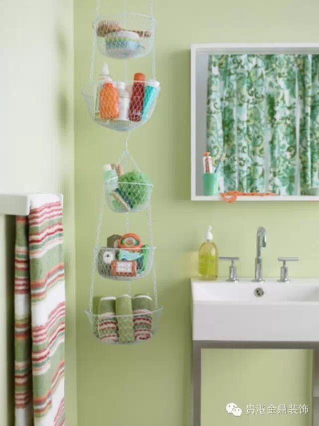 小清新的卫浴间,各种洗漱用品、毛巾被放在网状的吊兰内,吊在了台盆旁边,充分利用了空中面积啊。