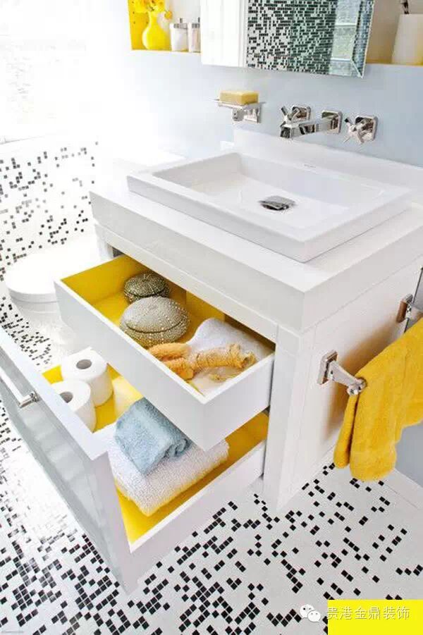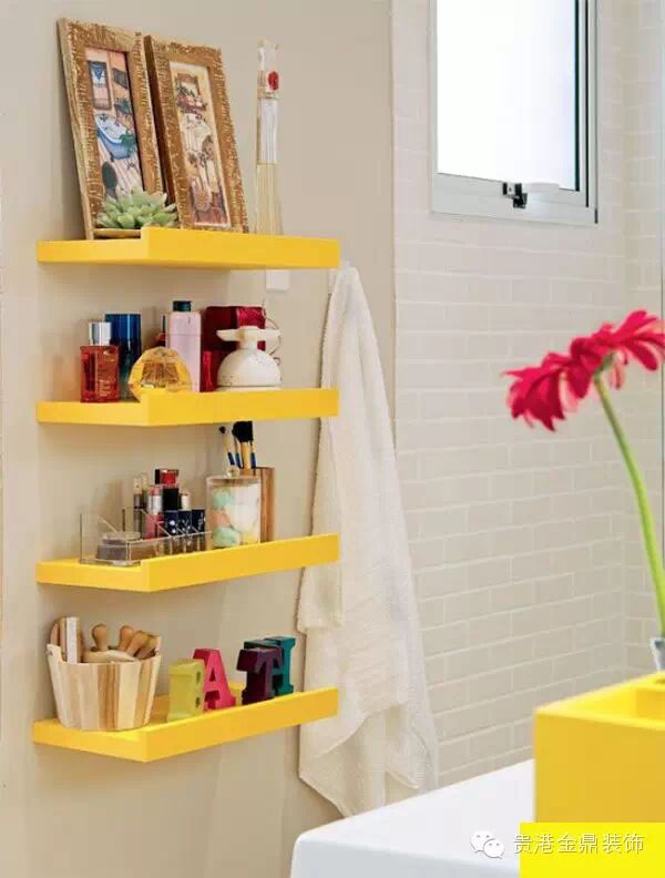 1、 在墙面上安装上简单的小搁架,各种物品就可以分类摆放,一目了然。亮黄的色彩,生动而有趣。 2、