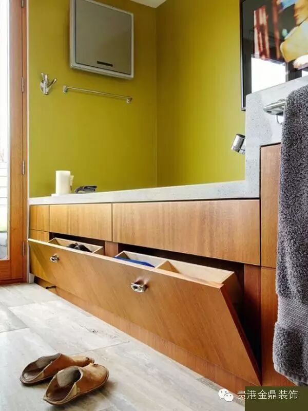 在台盆下方,选择带有抽屉的收纳柜,可以放入很多零碎的小物品。另外,在柜子一侧还可以装一个毛巾架,这样毛巾也有安身之处啦。