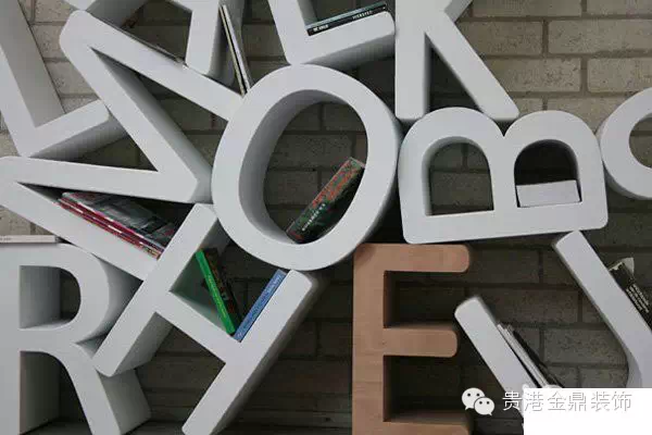 设计者在设计之上选用了大量的字母来打造一款别致的书架。各种字母毫无规律地被固定在墙面上,而读书之人便可以利用字母独有的造型,随意选择书籍的摆放之处。