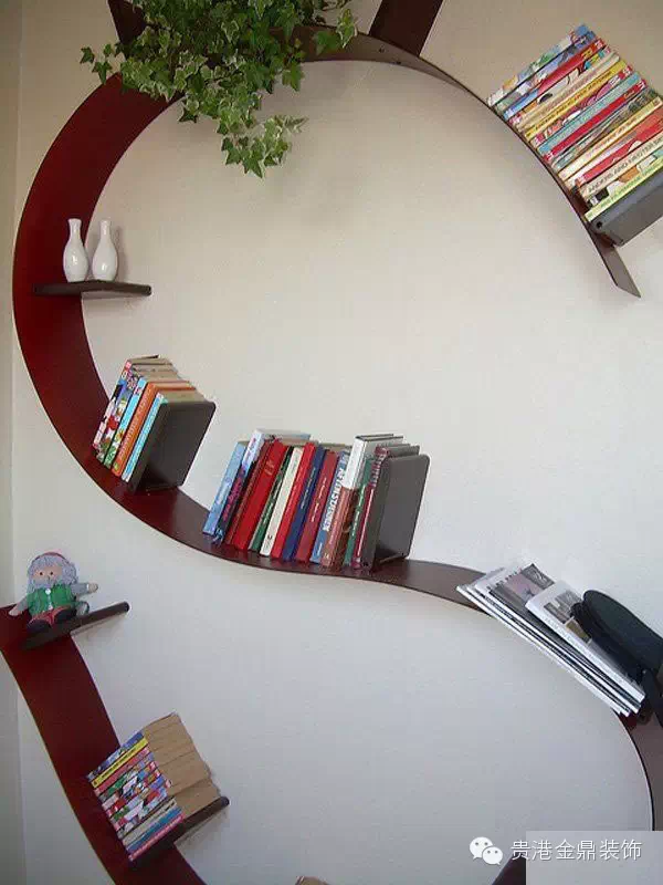 书架是一个巨大的“S”型,紧紧依托在墙壁之上,各种书籍被简单罗列在书柜之上,强烈的流线型给人带来视觉上的美感,加上一抹绿色的装饰,像极了一株红色藤蔓傍墙而生。