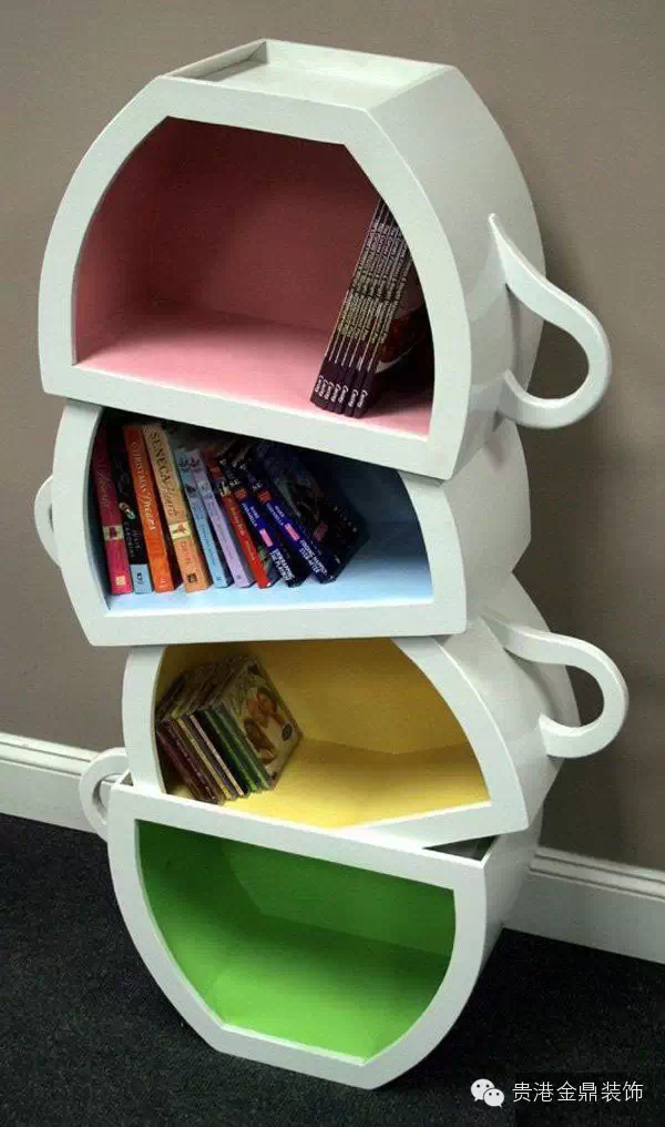 这款书架的设计简单而又可爱。设计者使用家居生活中常见的茶碗拼凑而成,白色的表面内部却是各有天地。不论是红色还是绿色,新鲜活泼的色彩都给你带来兴奋读书之感。