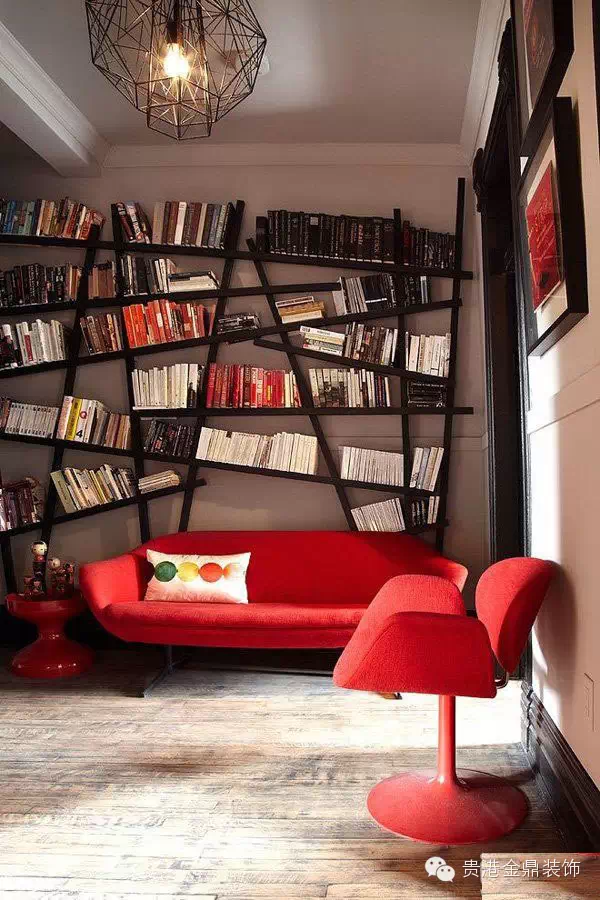 设计者将书架设计成依托在墙壁上纵横交错的线条。深色的线条或倾斜横放,或竖直罗列,衔接得天衣无缝。淡淡的工业风下更有耀眼的红色沙发与之相配,营造独特读书环境。