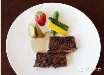 采用大连的雪花牛,烹调手法中西合璧,既用西式的黑胡椒、白兰地煎烹,又采用了中式焖制,还从营养角度配了秋葵、酸黄瓜和草莓三种蔬菜、水果。