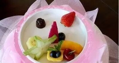 采用2公斤重抽气冰块凿雕成水晶果盘,内放优质瓷盘,配以多样低糖新鲜水果,上桌时在底盆间衬托一朵透明粉色荷花花瓣,在华灯下彰显美丽、动人。