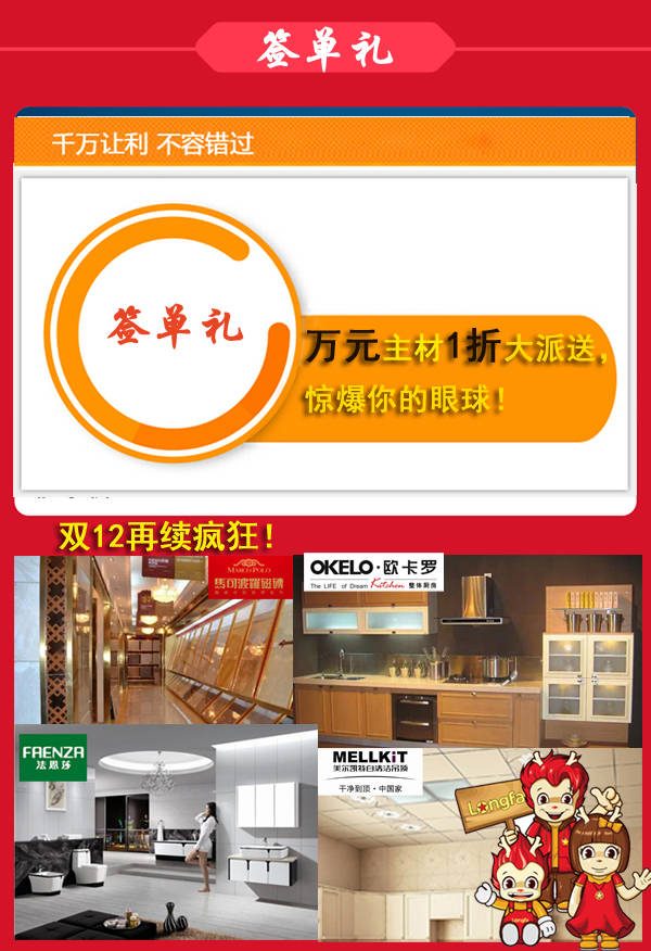 亲,你还记得2014年的龙发双11活动吗?是否趁双11活动超低价定装修呀?有没有因为出手太晚而没有抢定到龙发装饰呢?总有那么一群人似乎错过了那场优惠促销的活动,如今12月12日来临,龙发的年末大戏双十二来临了,没有定龙发装饰的业主们赶紧行动把,2014年龙发双12给您不一样的装修感受。让利!!让利!!让利!!年底一切只为冲业绩,零利润征集样板间!!