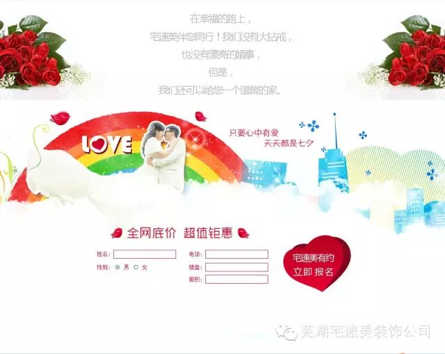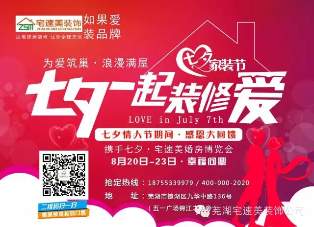不知从何时起,房子和爱情扯上了沉重的关系。在这浪漫的七夕情人节的氛围里,怎么能因为房子变得不那么轻松呢?而2015年的七夕佳节,不再只是天下有情人专属晒幸福的日子,在这一天,安徽芜湖的消费者也将迎来芜湖市2015年家居建材行业史无前例最大线下团购狂欢盛宴。如果爱TA,请带TA去参加芜湖市2015七夕家装节(宅速美装饰)。