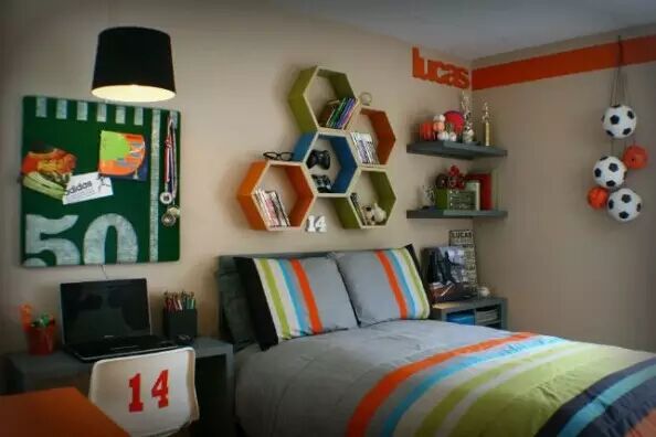 床头蜂窝形储物很有个性,右边挂着的足球也成了男孩子的标志性物品。